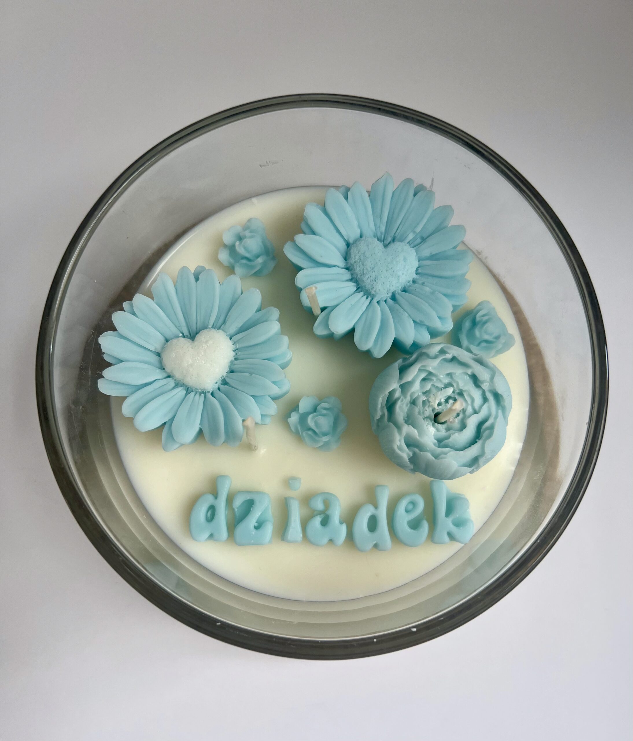 Ręcznie wykonana świeca z ok. 375g wosku sojowego, ozdobiona delikatnymi kwiatami w odcieniach błękitu i kremowej bieli, zachwyca subtelną estetyką. Napis „Dziadek” czyni ją idealnym prezentem pełnym ciepła i wdzięczności.