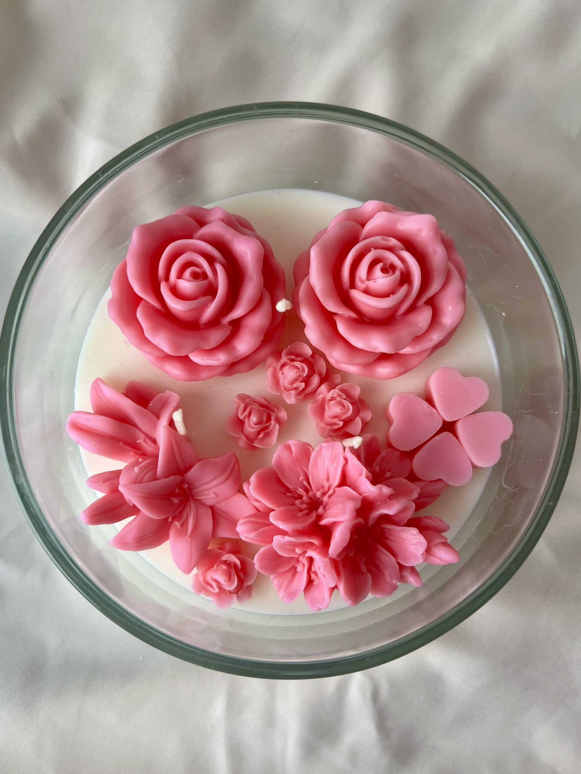 Świeca została wykonana z naturalnego wosku sojowego i ozdobiona ręcznie formowanymi kwiatami z wosku, które nadają jej wyjątkowy, dekoracyjny charakter.
