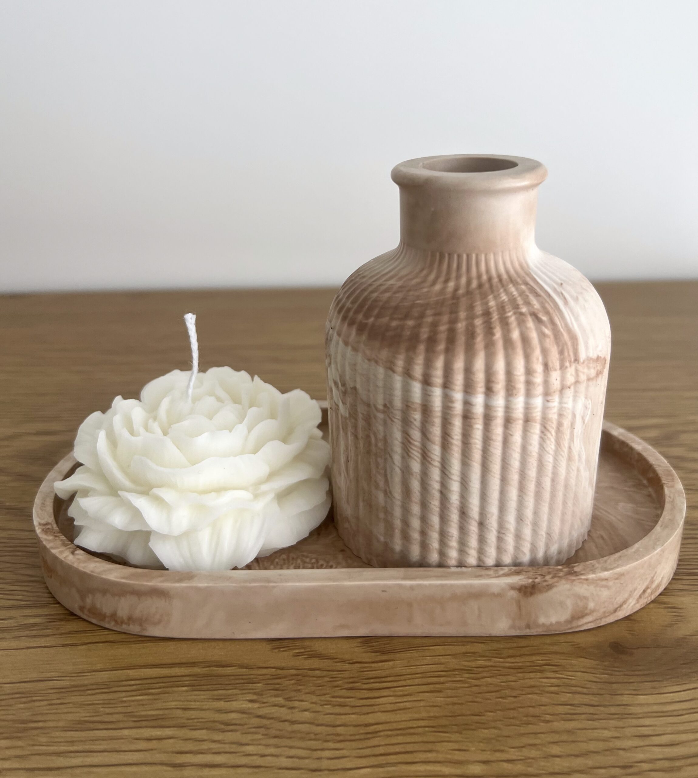 • Podstawka z gipsu polimerowego w kolorze beż&karmel – idealna jako baza pod świecę lub dekoracyjny element aranżacji