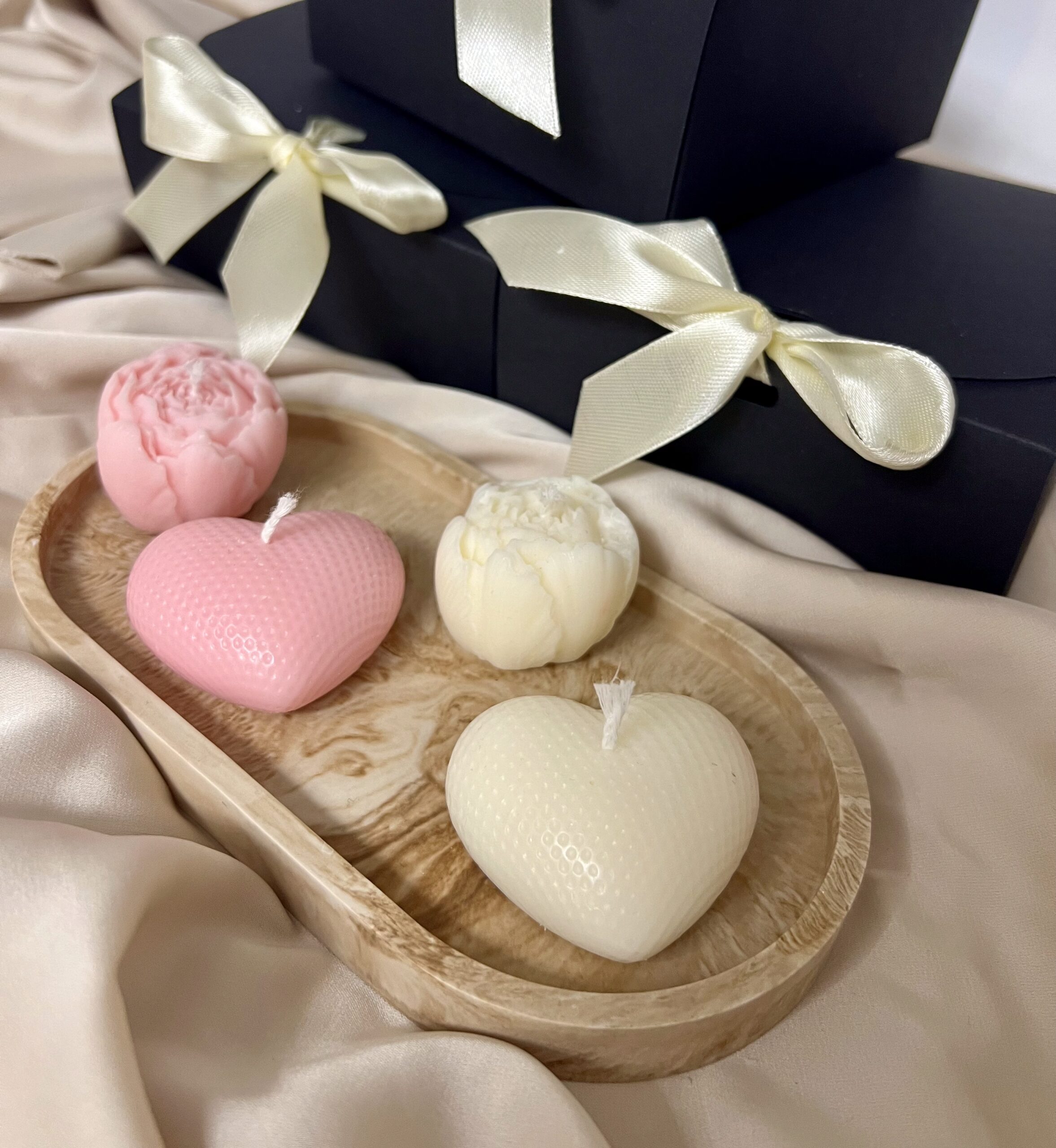 Świece w zestawie występują w kolorze naturalnym oraz pudrowego różu, co nadaje całości delikatnego i kobiecego charakteru.