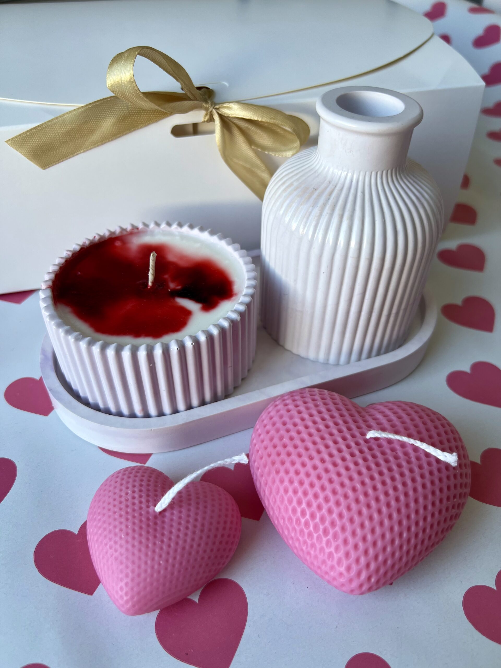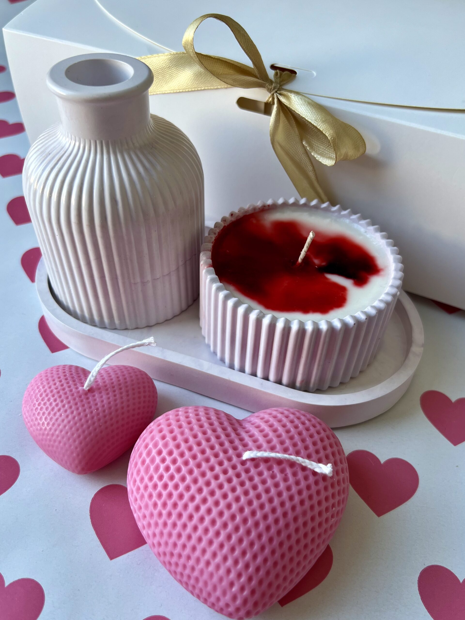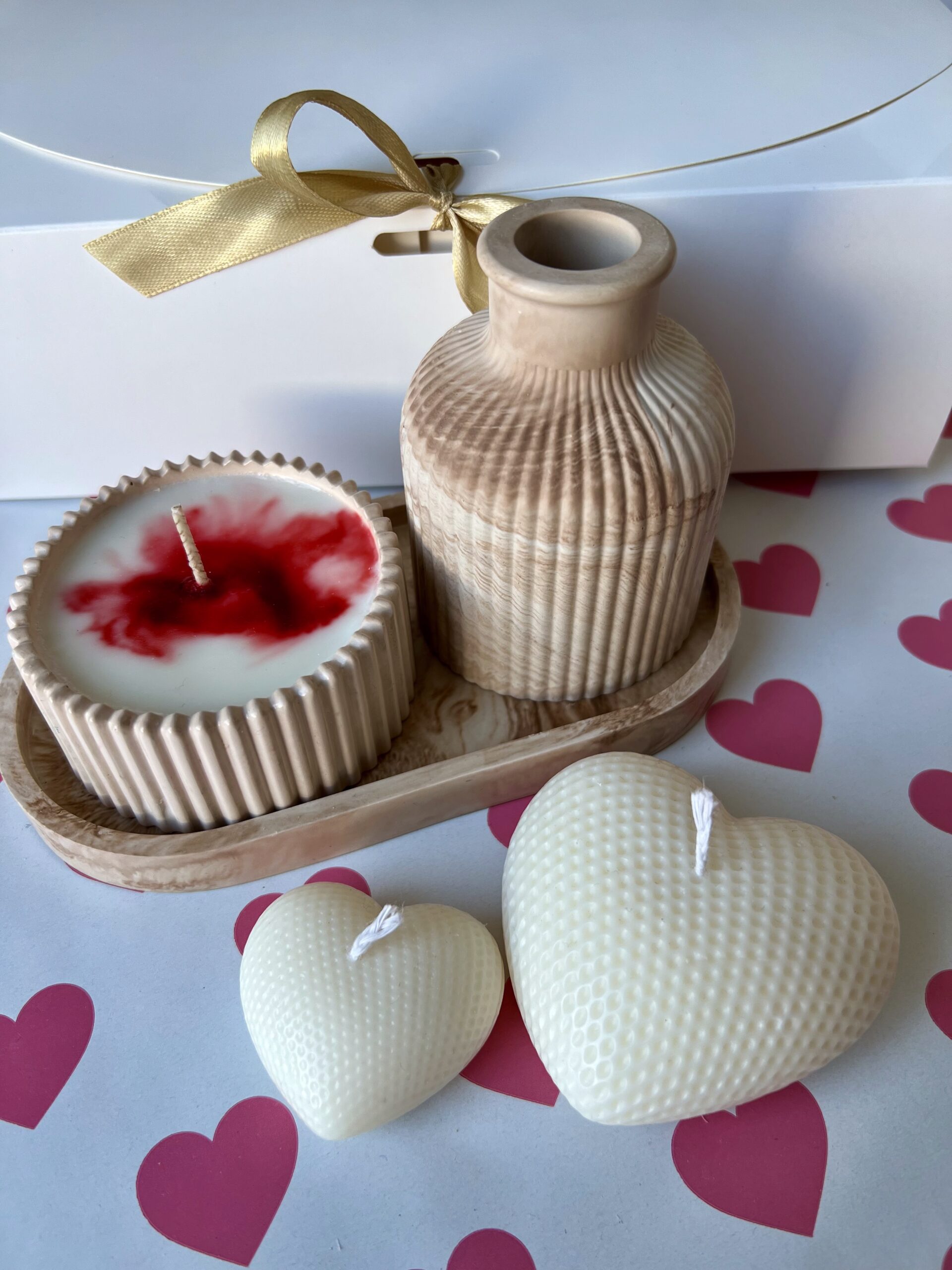 Ten walentynkowy zestaw łączy ciepłe, neutralne kolory z delikatną formą serc i kobiecymi zapachami: malina-róża oraz inspirowanym perfumami Lady Million. Subtelny, elegancki i pełen emocji – idealny prezent na Walentynki.